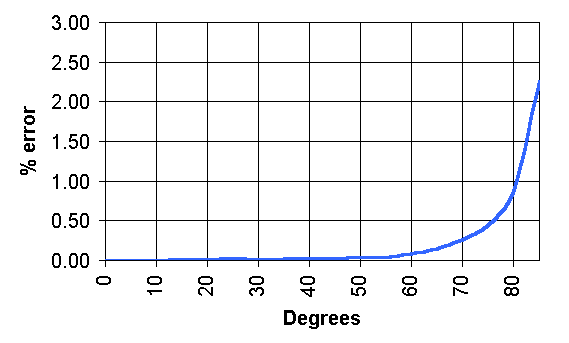 An ideal pyranometer collects radiation from horizon to horizon and should therefore have a reception angle of 180� in all directions. In reality, some low angle radiation will not be detected because of the geometry of the sensor but this has been minimized by the sensor head design. As can be seen from the cosine response graph, the cosine error for the Weather-Pro Pyranometer is typically less than 3% from vertical to 85� in all directions. |